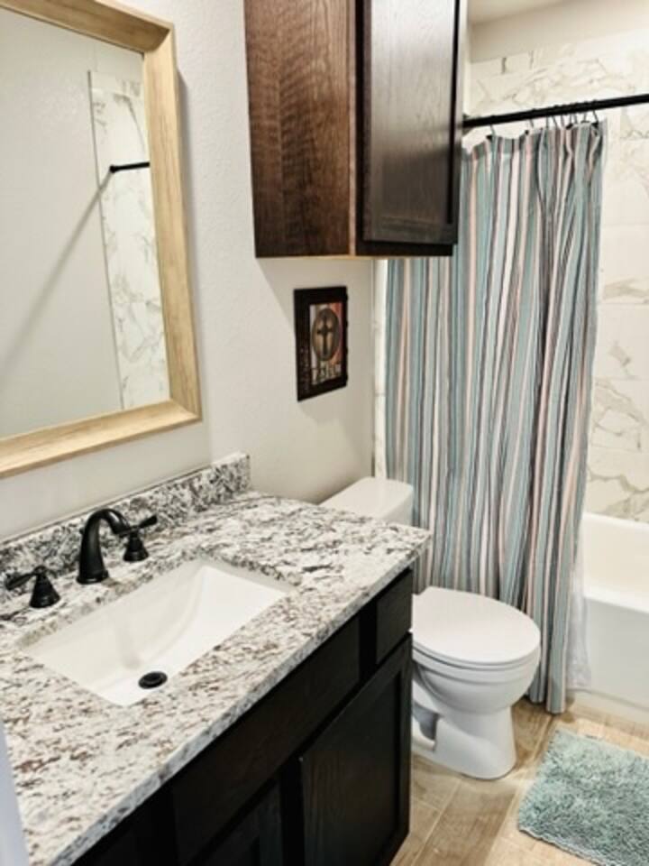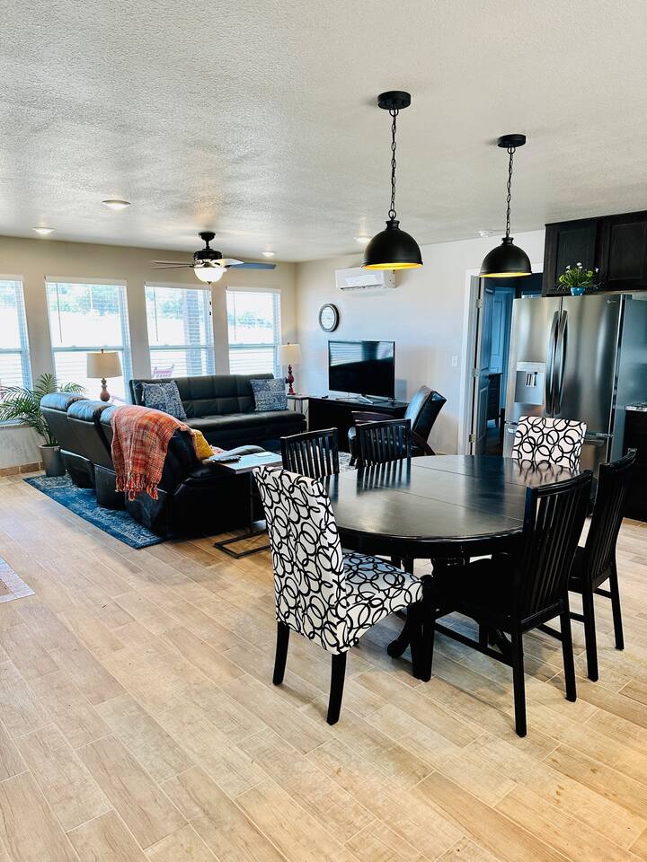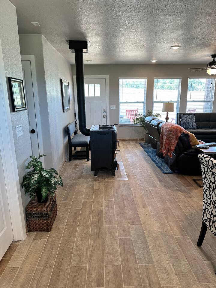 This home, in a Designated Night Sky Viewing Area, is beautifully decorated and designed for comfort, with a fantastic split layout for the two bedrooms and baths. Bedroom 1: King Bed, bath with two sinks. Tub/Shower, Walk-in-Closet, Roku TV. Bedroom 2: Queen bed, XL Twin trundle. Next to bathroom with tub/shower combo; walk-in closet, Roku TV. Internet: 25 Mbps download speed/5 Mbps upload. My husband works from home on video while I stream and it works great. Kitchen: Fully stocked, gorgeous granite counter tops, Stainless Steel Appliances, Large walk-in pantry, Berkey water filter, many small appliances (toaster, instant pot, crock pot, electric frying pan PLUS...) Living Room: Seats 7, one reclining couch, Roku TV, one couch turns into twin bed. Laundry Room: Washer and dryer, detergent provided. Gas BBQ grill: Just off of back patio, gas tanks provided. Watch the sunset from the large front porch with two rocking/gliding chairs and a hammock, and the sunrise from the large back porch with a comfortable patio set and hot tub for five people to enjoy--a place where you can also BBQ using the grill. Our property is part of the "Designated Night Sky Viewing" area, so if you enjoy seeing the stars, you will enjoy evenings and nights at our property. With a small Basketball court (two basketballs provided) and tetherball, along with a cornhole set, there is plenty to do in the outdoors, even when at the home. Some attractions/Activities: Water Access, Fishing, Canoeing and Kayaking: Buffalo River Access: Town of Ponca, 9.6 miles; City of Jasper, 24.4 miles Hiking: Big Bluff & and the Goat Trail, 13 miles Hiking: Hemmed-in-Hollow Falls, 5.8 miles Hiking: Paige Falls: 6.1 miles Hiking: Hideout Hollow Trail, 6.8 miles Biking: Arkansas Monument Trails: Google it (can't add the link here unfortunately). Stargazing ("Designated Night Sky Area"): Our front and back porches , AND from the hot tub:) As far as supplies, we give you plenty of toilet paper, dish soap, paper towels, garbage bags, dishwasher pods, hand soap, shampoo, conditioner and body wash. We even provide toothbrushes, toothpaste, hand lotion, individual deoderant wipes and more in each bathroom in case you forgot yours. Besides the privacy and peaceful setting provided at our home, we have a small basketball court with two basketballs available, tetherball (do you know what that is?...play at your own risk, haha!), a corn hole game (found on the back porch) so that you can get out and enjoy the outdoors together with your friends and family. We also offer an indoor game called Pepper Pong that is played on the dining room table (like Ping Pong). Our home is a 30-minute drive from Harrison where you can find several fast-food and sit-down restaurants, a Home Depot, a Walmart, and a Hobby Lobby among other things. We highly recommend Jamie's Local Flavor (high quality steaks/sandwiches, etc for decent prices) and Nopalitos if you like Mexican cuisine. Neighbor's Mill Bakery is also perfect for breakfast or lunch. Be sure to bring your initial groceries (at least) so that you don't have to run into Harrison early the next day! How is the condition of the dirt road? It depends on how much it has rained. Within 24 hours after the rain stops, it is starting to dry up and back to good condition. You would probably want an SUV when the road is at its worst (wet/muddy). The road is graded after each big rain, especially from Hwy 43 to the property. If it is or has been wet, we suggest that to come in from Hwy 412, you stay on 103 until you get to Hwy 43, and come in that way, rather than going the back way at Osage. With just about everything you could need, you will really enjoy the comfort, solitude and quietness of this comfortable and well-stocked home, with many hiking, biking and river opportunities close by.