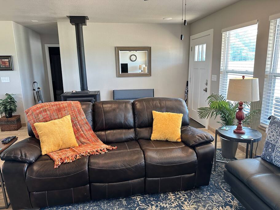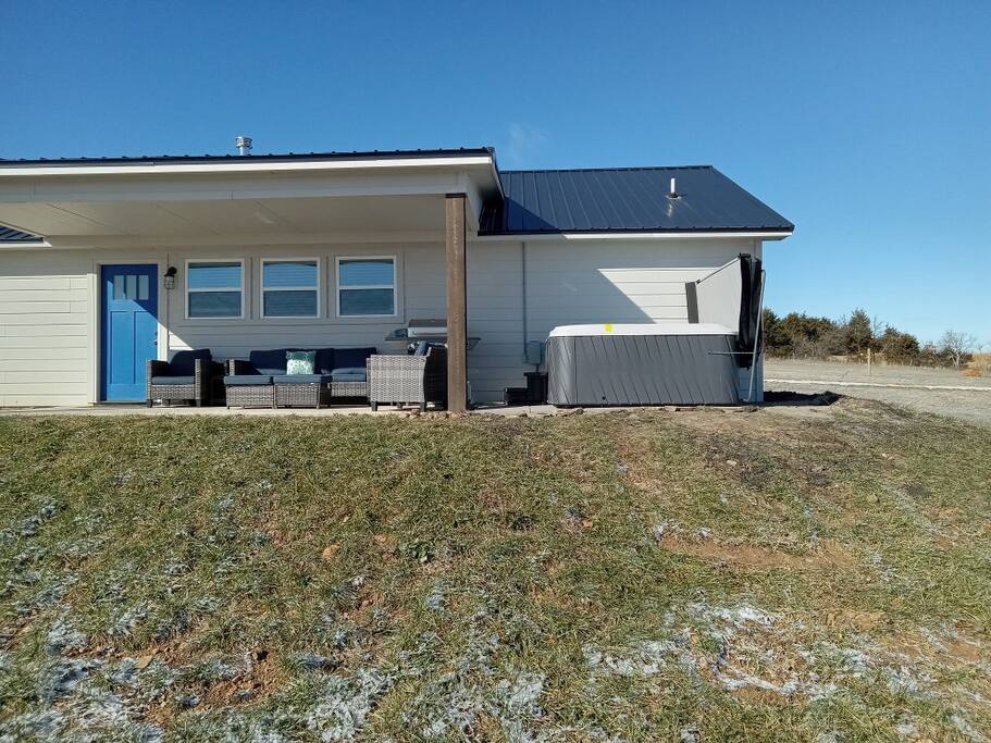 Note: We just want to let you know that we are building another small home on the front of the property. It's getting close to being done and occasional contractors will come work here and there. Noise should be minimal, if you hear anything at all. This home is beautifully decorated, with a fantastic split layout for the two bedrooms and baths. Bedroom 1: King Bed, bath with two sinks. Tub/Shower, Walk-in-Closet, Roku TV. Bedroom 2: Queen bed, XL Twin trundle. Next to bathroom with tub/shower combo; walk-in closet, Roku TV. Internet: 25 Mbps download speed/5 Mbps upload. My husband works from home on video while I stream and it works great. Kitchen: Fully stocked, gorgeous granite counter tops, Stainless Steel Appliances, Large walk-in pantry, Berkey water filter, many small appliances (toaster, instant pot, crock pot, electric frying pan PLUS...) Living Room: Seats 7, one reclining couch, Roku TV, one couch turns into twin bed. Laundry Room: Washer and dryer, detergent provided. Gas BBQ grill: Just off of back patio, gas tanks provided. Watch the sunset from the large front porch with two rocking/gliding chairs and a hammock, and the sunrise from the large back porch with a comfortable patio set and hot tub for five people to enjoy--a place where you can also BBQ using the grill. Our property is part of the "Designated Night Sky Viewing" area, so if you enjoy seeing the stars, you will enjoy evenings and nights at our property. Some attractions/Activities: Water Access, Fishing, Canoeing and Kayaking: Buffalo River Access: Ponca, 9.6 miles; Jasper, 24.4 miles Hiking: Big Bluff & and the Goat Trail, 13 miles Hiking: Hemmed-in-Hollow Falls, 5.8 miles Hiking: Paige Falls: 6.1 miles Hiking: Hideout Hollow Trail, 6.8 miles Biking: Arkansas Monument Trails: Google it (can't add the link here unfortunately). Stargazing ("Designated Night Sky Area"): Our front and back porches , AND from the hot tub:) As far as supplies, we give you plenty of toilet paper, dish soap, paper towels, garbage bags, dishwasher pods, hand soap, shampoo, conditioner and body wash. We even provide toothbrushes, toothpaste, hand lotion, individual deoderant wipes and more in each bathroom in case you forgot yours. Bring your food with you unless you want to go back to Harrison (30 min drive) to pick some up. Besides the privacy and peaceful setting provided at our home, we have a small basketball court with two basketballs available, tetherball (do you know what that is?...play at your own risk!), a corn hole game (found on the back porch) so that you can get out and enjoy the outdoors together with your friends and family. We also offer an indoor game called Pepper Pong that is played on the dining room table (like Ping Pong). Our home is a 30-minute drive from Harrison where you can find several fast-food and sit-down restaurants, a Home Depot, a Walmart, and a Hobby Lobby among other things. We highly recommend Jamie's Local Flavor (high quality steaks/sandwiches, etc for decent prices) and Nopalitos if you like Mexican cuisine. Neighbor's Mill Bakery is also perfect for breakfast or lunch. Be sure to bring your initial groceries (at least) so that you don't have to run into Harrison early the next day! How is the condition of the dirt road? It depends on how much it has rained. Within 24 hours after the rain stops, it is starting to dry up and back to good condition. You would probably want an SUV when the road is at its worst (wet/muddy). The road is graded after each big rain, especially from Hwy 43 to the property. If it is or has been wet, we suggest that to come in from Hwy 412, you stay on 103 until you get to Hwy 43, and come in that way, rather than going the back way at Osage. With just about everything you could need, you will really enjoy the comfort, solitude and quietness of this comfortable and well-stocked home, with many hiking, biking and river opportunities close by.